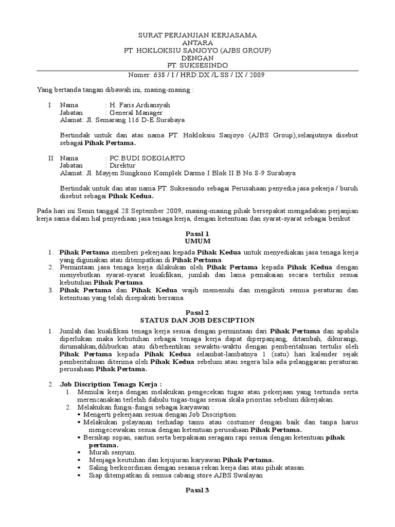 Contoh Surat Perjanjian Kerjasama Perusahaan Pdf - Surat Perjanjian Kerjasama Kaos / Surat perjanjian kerjasama antara pelaksana kegiatan dan penyedia barang/jasa.. Untuk memudahkan anda dalam mendownload surat perjanjian tersebut kami juga menyediakan soft. Download contoh surat perjanjian kerja, surat yang mengikat hubungan kedua belah pihak selama periode waktu kerja tertentu. 2 berkewajiban melakukan pembinaan dan pengawasan terhadap kinerja dan perilaku tenaga kerja yang ditempatkan di perusahaan pihak pertama. Contoh surat perjanjian kerjasama diperlukan untuk anda yang ingin membuat surat perjanjian bisnis. Dokumen perjanjian kerja sebagaimana ditentukan dibawah ini harus dibaca serta merupakan bagian dari perjanjian kerja ini, yaitu: